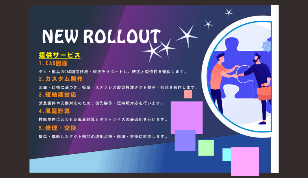 プラントや工場で使われる特注排気ダクト製品(オーダーメイドダクト部品)はお客様のご要望に合わせた仕様でオーダー製作することができます。